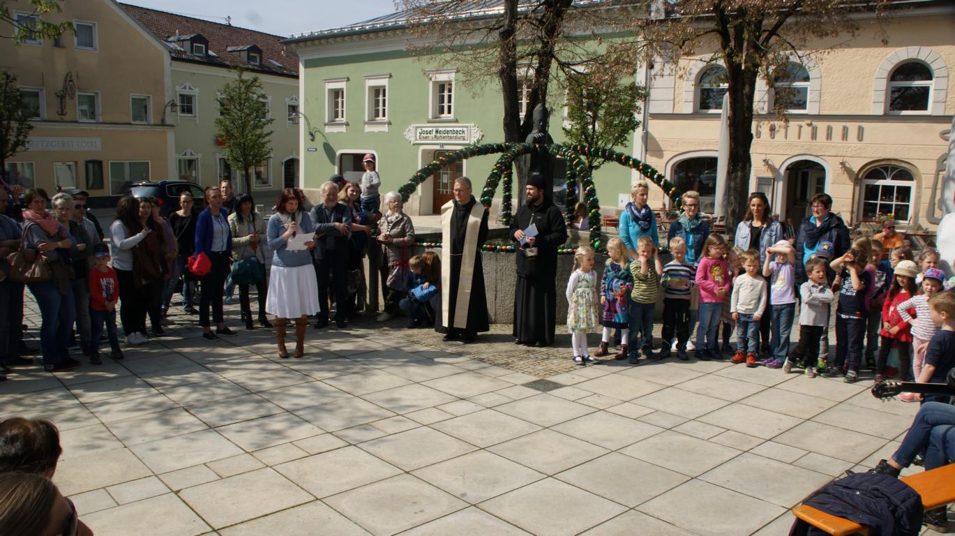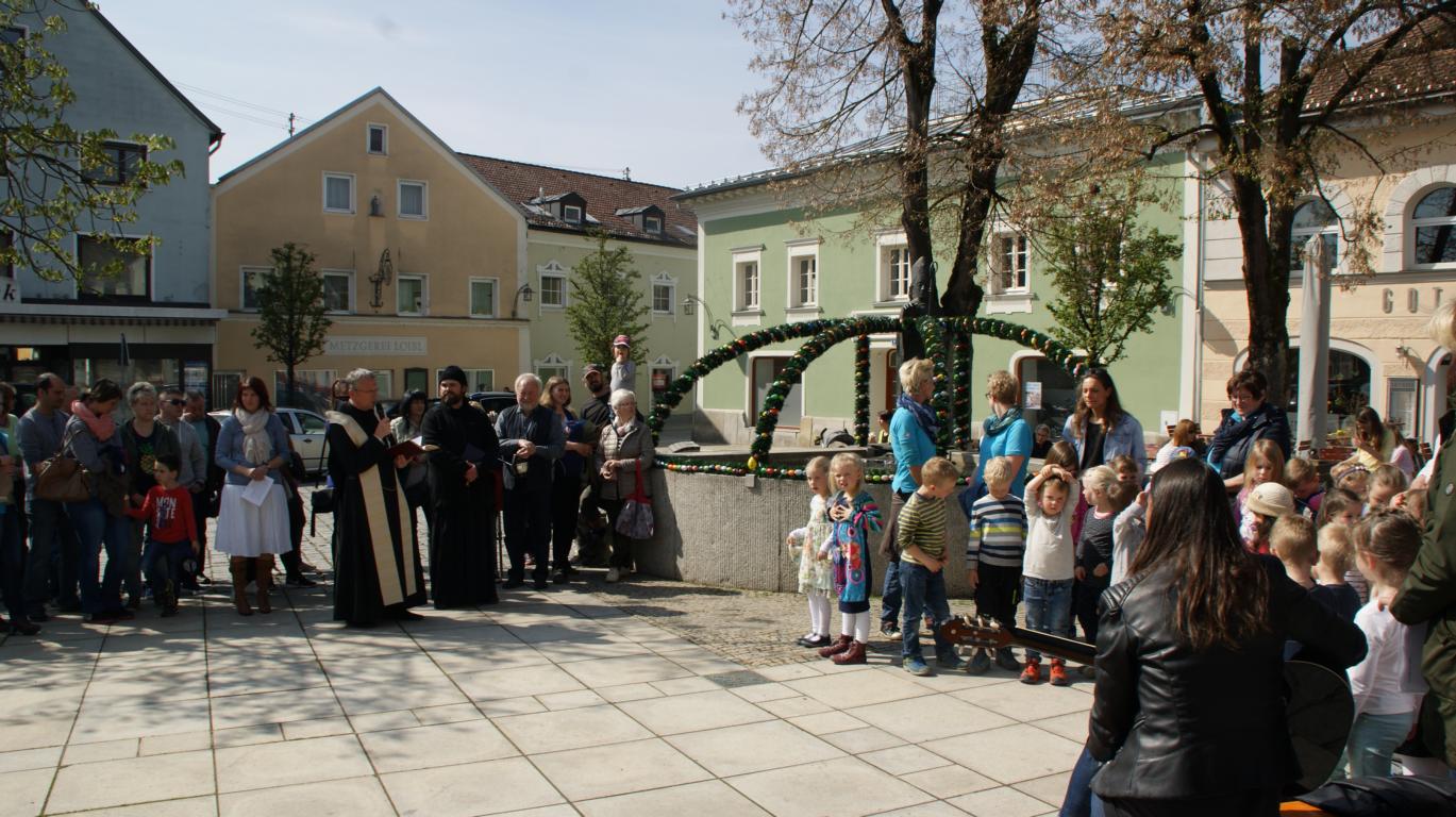 Strahlender Sonnenschein und hunderte Gäste verfolgten den Festakt am Marktplatz,der von den Kindergartenkindern mit Osterliedern umrahmt und mit der Preisverteilung