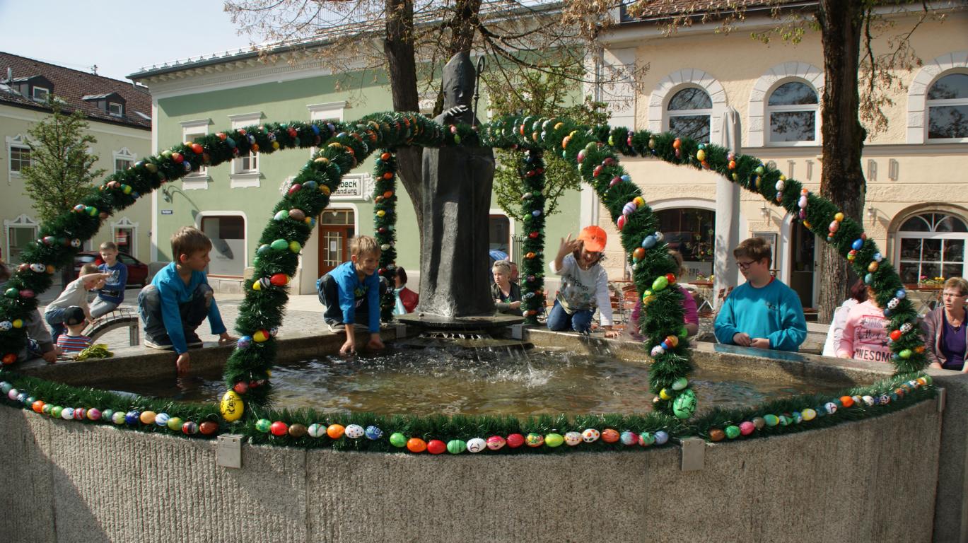 646 Eier zieren den Osterbrunnen am Marktplatz in Hengersberg, der am Samstagnachmittag