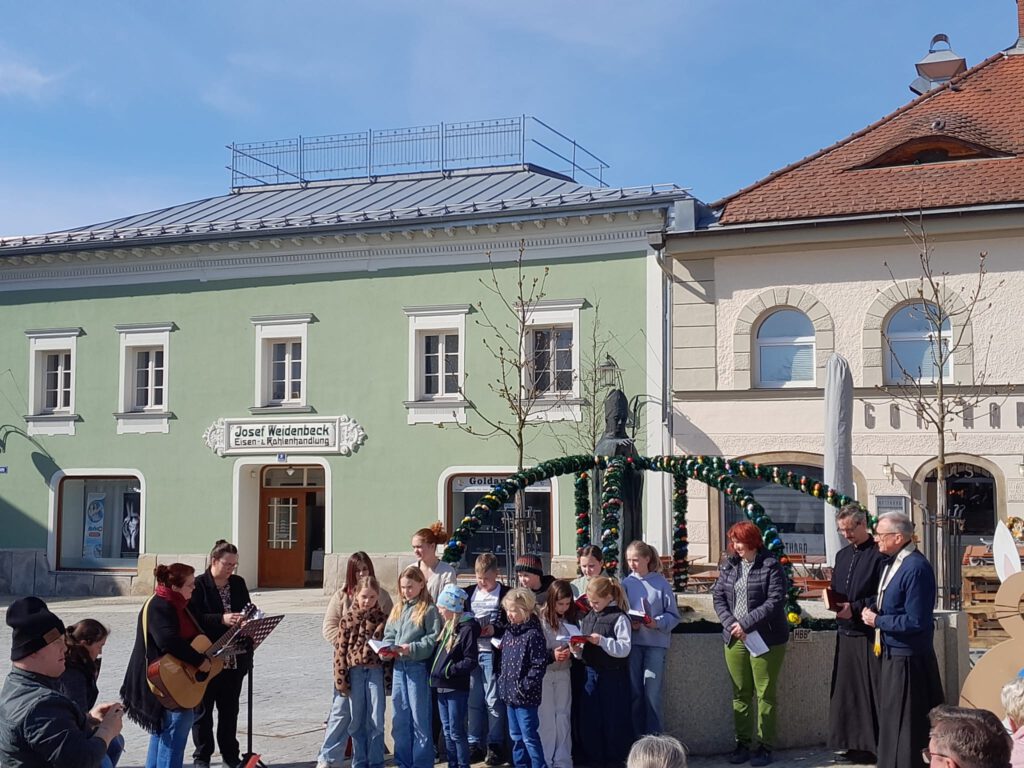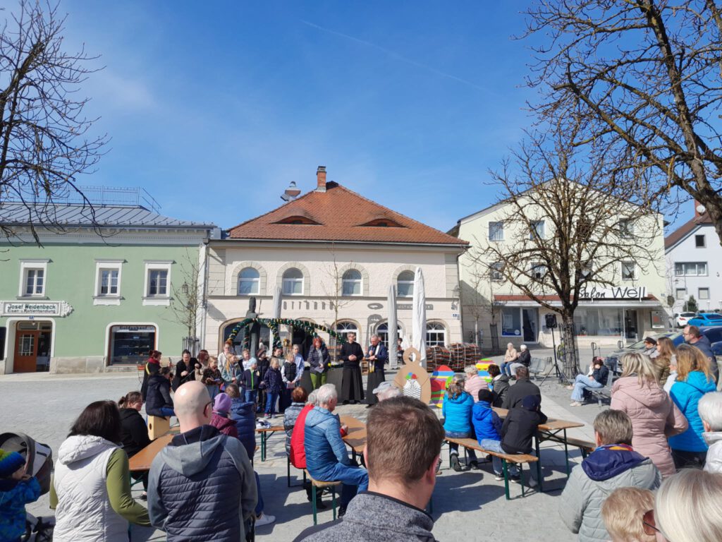 Nach der Begrüßung durch Anja Holzfurtner, der Vorsitzenden des HBB, eröffnete der Kinderchor Hengersberg mit einem Lied feierlich die Veranstaltung. Im Anschluss fand eine kurze Andacht mit Pater Thomas Wagner und Frater Serafin Becker statt. Dabei wurde der Osterbrunnen gesegnet. Nach einem gemeinsamen Vaterunser und noch zwei Liedern des Kinderchores bedankte sich Anja Holzfurtner bei allen, die zum Gelingen des Festes beigetragen haben – beim Bauhof für die Reinigung und Befüllung des Brunnens, bei den Geistlichen für die feierliche Andacht und bei den Kuchenbäckerinnen und – bäckern für die zahlreichen Kuchenspenden. Auf die